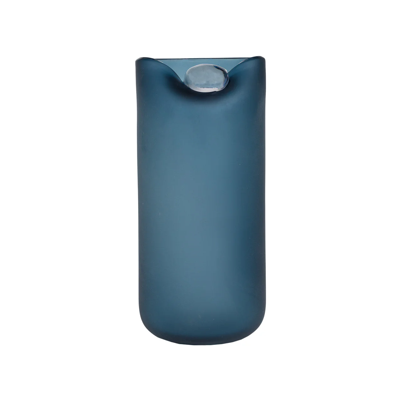 The Alessia Vase brings modern sophistication to interior design with its sleek cylindrical silhouette. This contemporary blue art glass vase stands 13 inches tall with a 6-inch diameter, creating a striking focal point for any room. Handcrafted with meticulous attention to detail, the vessel features a unique sculptural element - a graceful dip in the rim adorned with an artful glass orb that adds visual intrigue. The rich blue hue catches and reflects light, while the minimalist design complements both modern and transitional home decor styles. Perfect for styling on mantels, console tables, or floating shelves, this decorative vase makes a statement whether displayed solo or paired with complementary pieces. The versatile size and timeless aesthetics of the Alessia Vase work beautifully in living rooms, dining spaces, or entryways, offering endless possibilities for creative styling and home accent pieces.