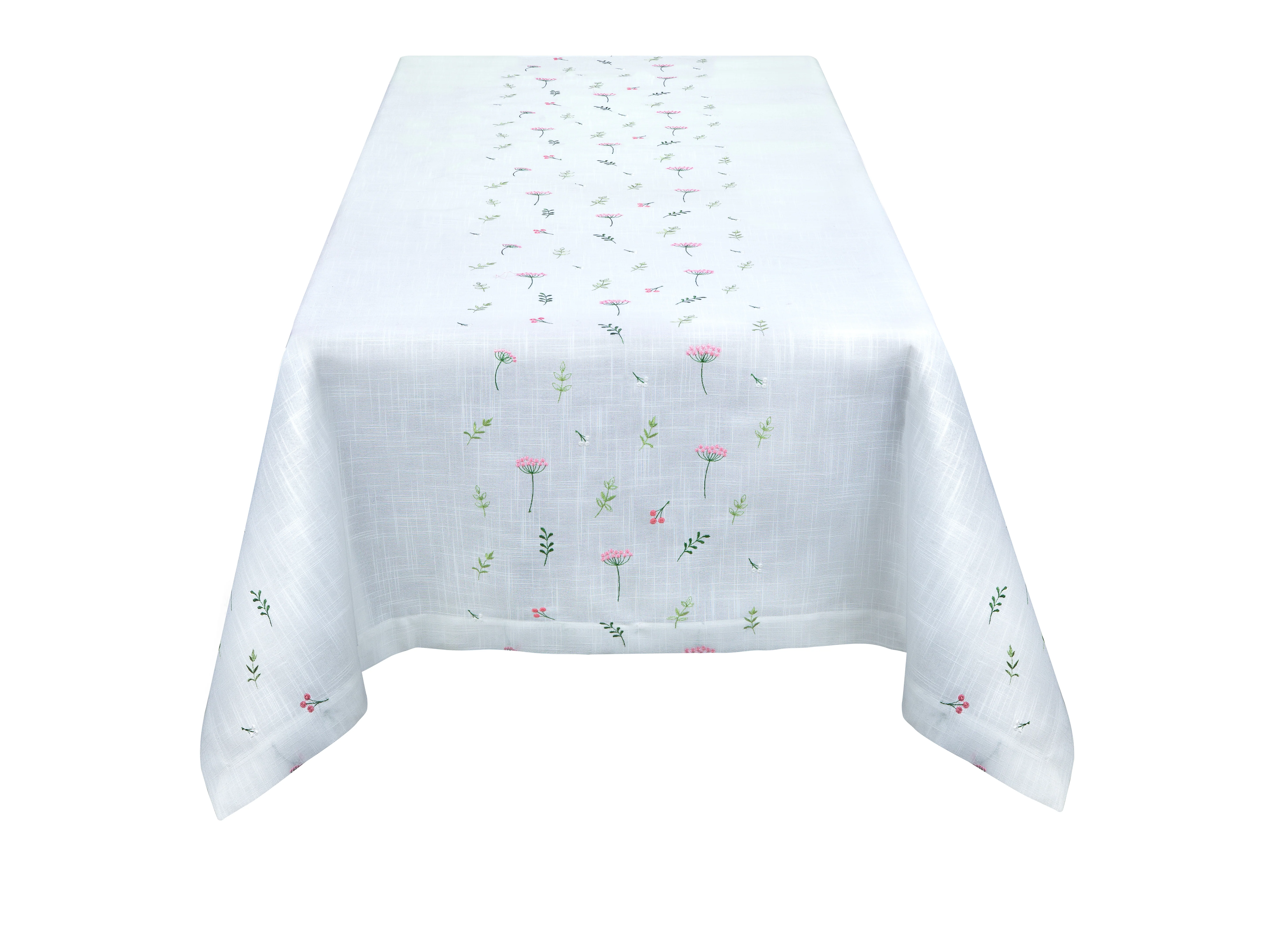 Elevate your dining experience with our exquisite Flora Tablecloth, featuring a pristine white fabric adorned with delicate embroidered flowers. Transform your meals into memorable moments with this beautiful and functional piece.