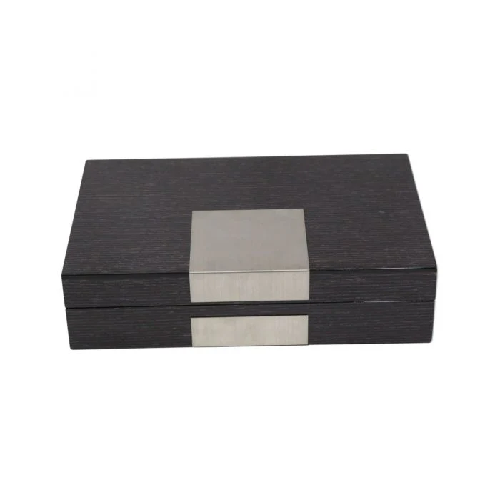 This beautiful Kent lacquered "Steel Gray" Wood valet box is the perfect gift for the jewelry lover in your life. This box features multiple compartments including ring roll and a pocket. Various sized compartments hold both small and large pieces and is lined in contemporary velour to prevent scratching of your treasured items. Stainless Steel accents add a modern style to the look of the box. Lacquered "Steel Gray" Wood Valet Box with Stainless Steel Accents and Multi Compartments Storage.